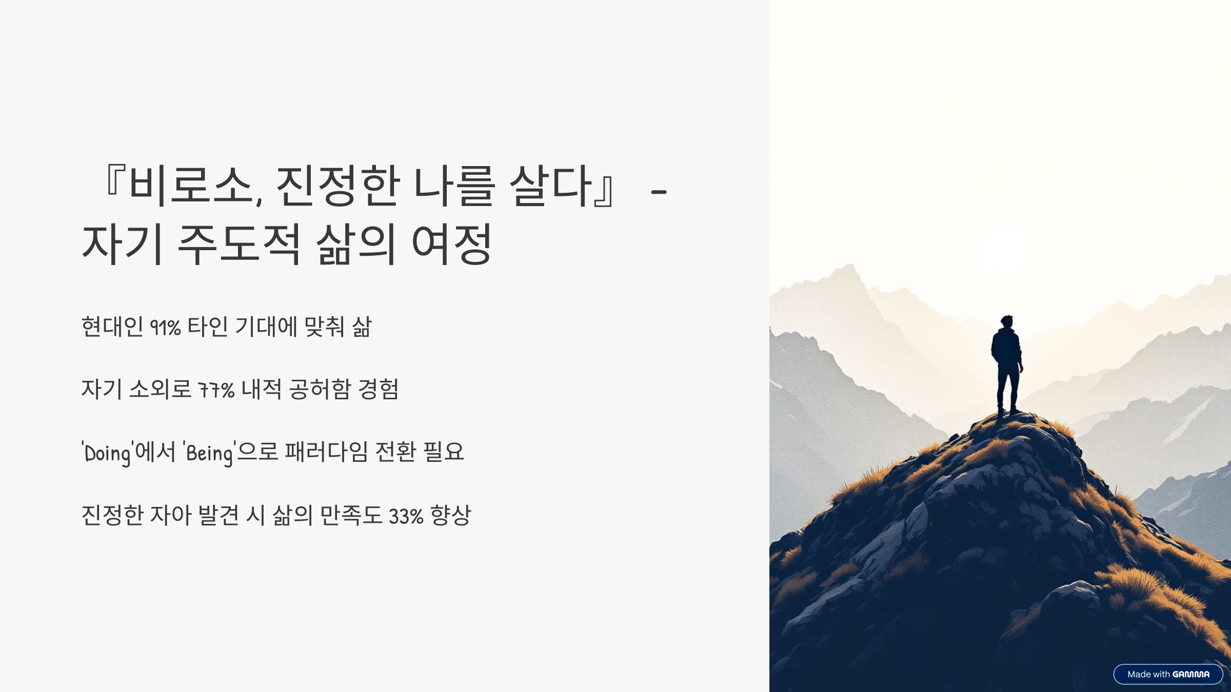 타인의 기대에 휘둘리며 사는 이들에게 진정한 자기로 돌아가는 길을 안내합니다.