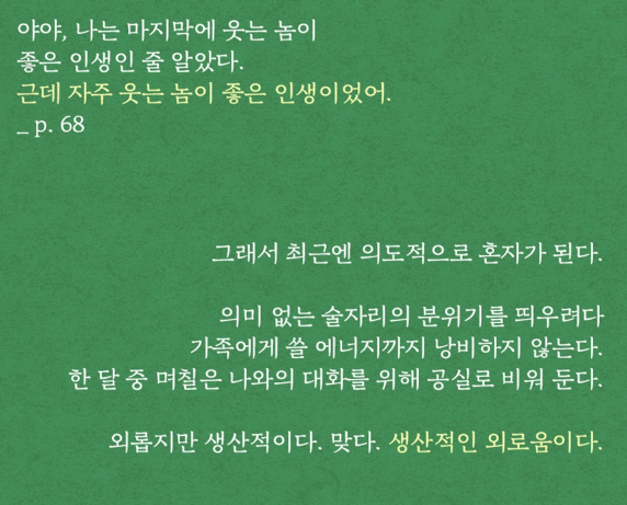 "그냥 지금처럼 살아라. 그렇게 살되 어떤 감정조차 책임질 수 없을 만큼 힘든 날, 마음속이 온통 타인의 감정으로 가득해 당장이라도 터져버릴 것 같은 그런 날. 부러 나밖에 없는 공간으로 도망가자. 그 조용한 공간에서 자신에게도 이렇게 말할 기회를 주자."